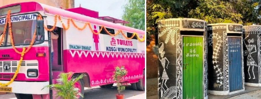 She Mart & Loo A modern, hygienic and accessible public restrooms for women ensconced with She-Marts having products related to menstrual hygiene, sanitary napkins vending machines, etc,. Entire She Mart & Loo is made up of recycled plastic waste and was taken up by corporates and public sectors in to CSR. It provides market place for tiny business- women, livelihood for urban labour, public health and hygiene, improve solid waste management and to create Open Defecation Free (ODF) urbans. This initiative has a combination of objectives of Swachh Bharat Mission, DAY-NULM.